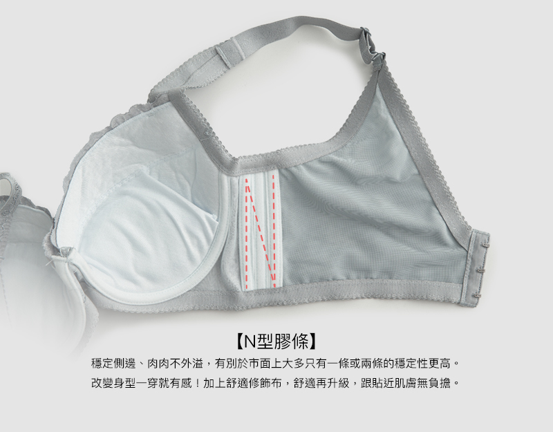 功能性:內提托(集中托高)、N型塑片(收副乳)、高背設計(撫平背肉)、低脊心設計(不壓迫胸骨)、三排扣