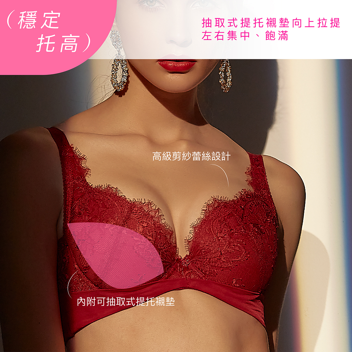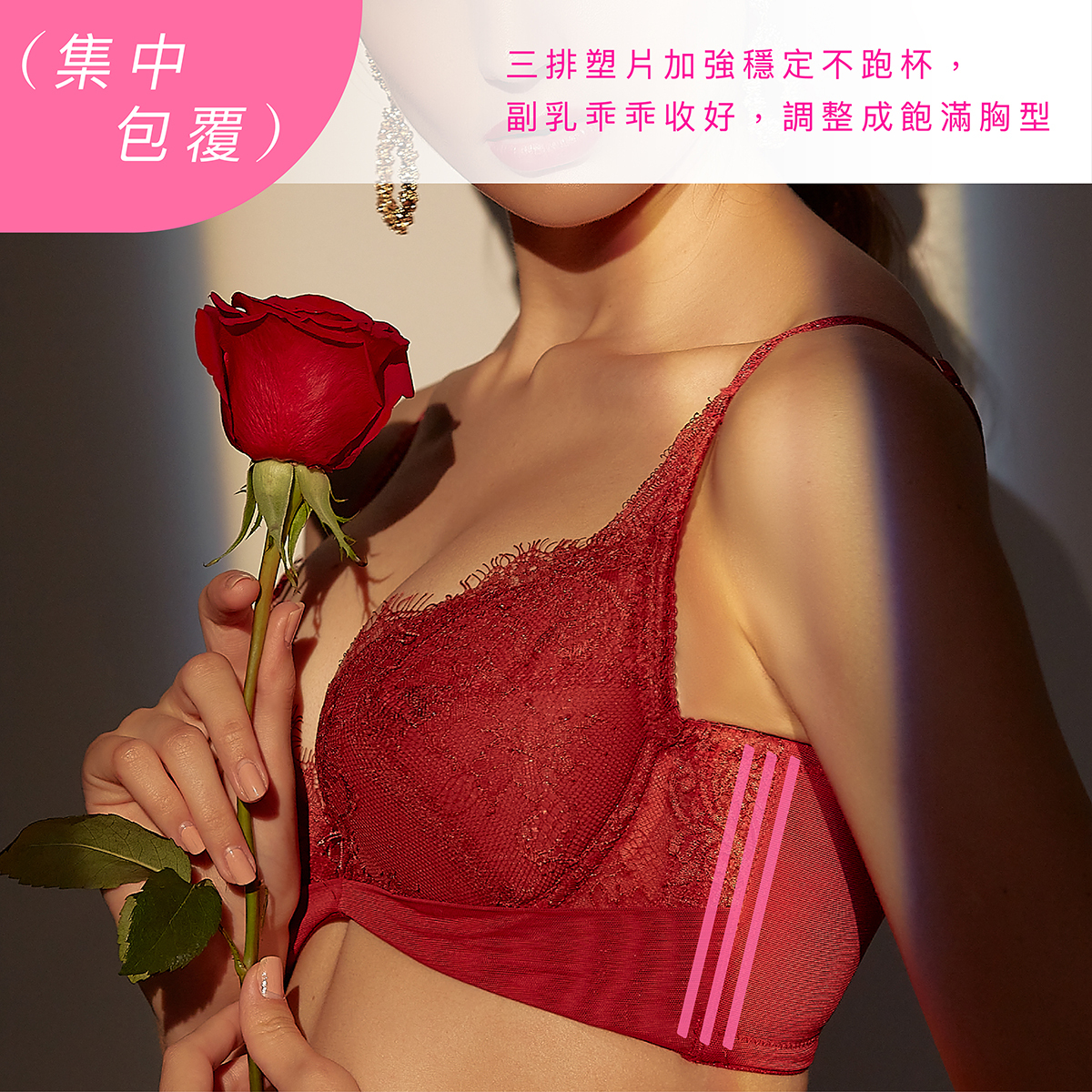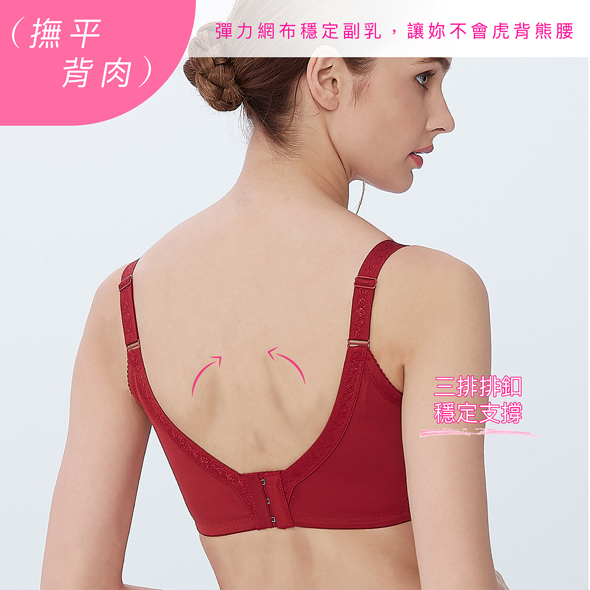 功能性:內提托(集中托高)、高背設計(撫平背肉)、低脊心設計(不壓迫胸骨)、三排扣