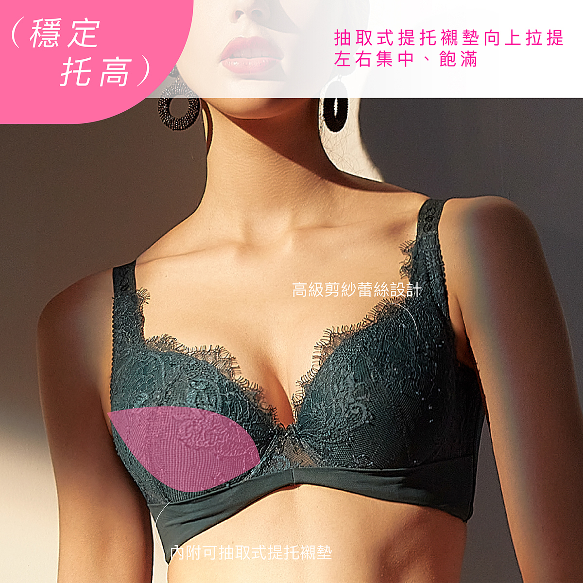功能性:內提托(集中托高)、高背設計(撫平背肉)、低脊心設計(不壓迫胸骨)、三排扣