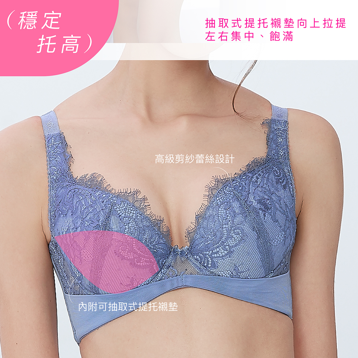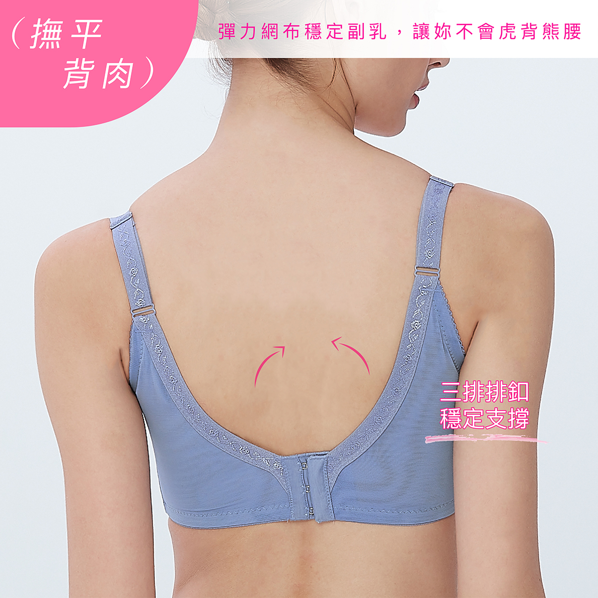 功能性:內提托(集中托高)、高背設計(撫平背肉)、低脊心設計(不壓迫胸骨)、三排扣