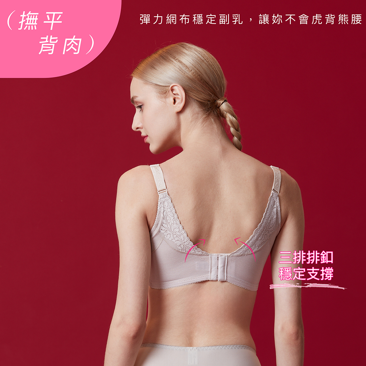 功能性:外提托(集中托高)、高背設計(撫平背肉)、低脊心設計(不壓迫胸骨)、三排扣