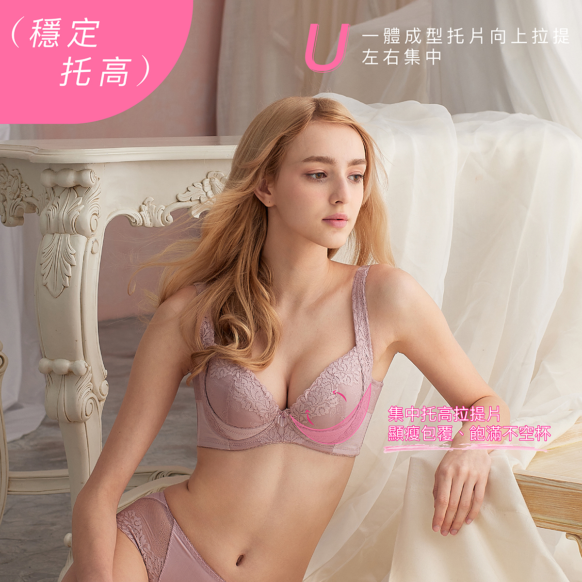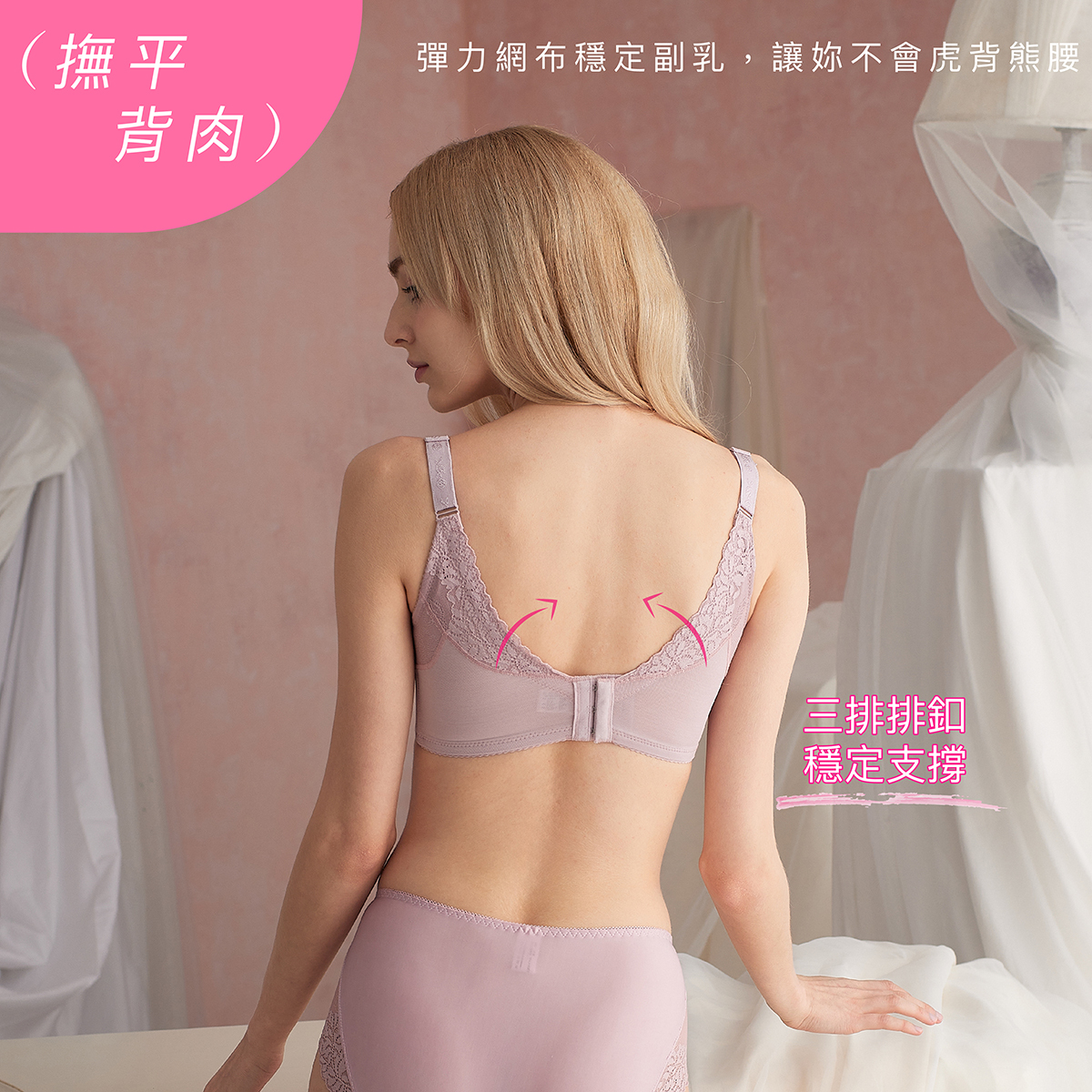 功能性:外提托(集中托高)、高背設計(撫平背肉)、低脊心設計(不壓迫胸骨)、三排扣